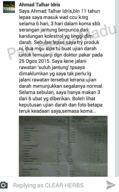 "Saya masuk wad ccu selama 6 hari,3 hari koma disebabkan serangan jantung berpunca dari kolesterol tinggi. Sebulan lepas saya amalkan Pati Herbamadu dan 2 minggu selepas tu saya ada temujanji dengan doktor pakar untuk jalani rawatan ' suluh jantung' . Hasil dari pemeriksaan oleh doktor pakar, ujian darah saya normal dan tak perlu jalani rawatan tu lagi. Alhamdulilah " - Ahmad Talhar